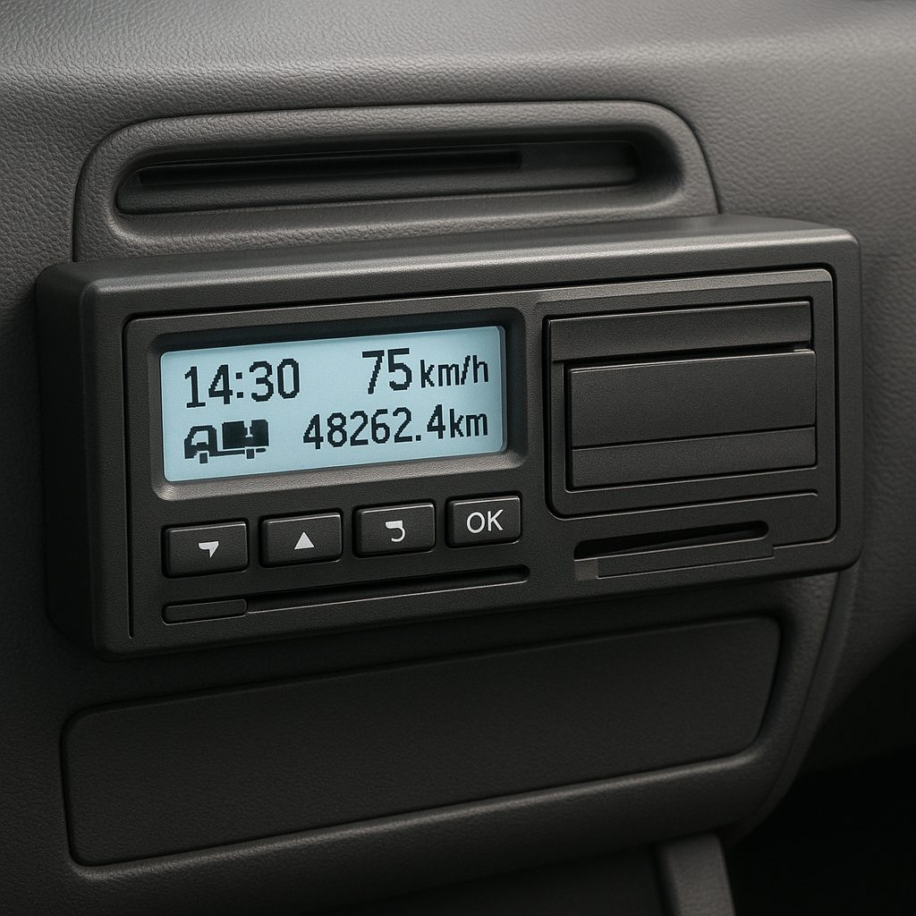 • Czytnik karty kierowcy – umożliwia identyfikację osoby prowadzącej pojazd oraz zapisuje jej aktywność.